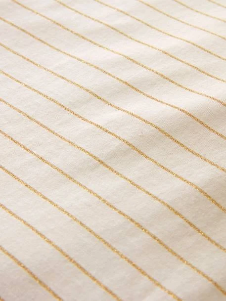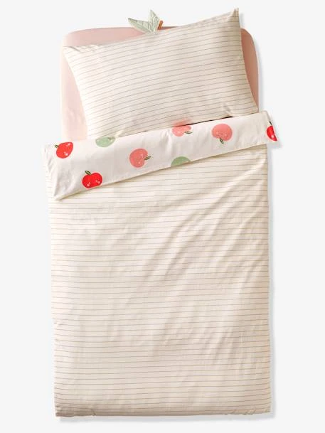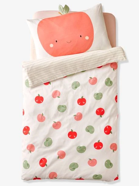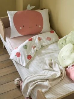 Baby’s bed is decorated with our lovely little smiling apples! A fun and colourful duvet cover with apples on the one side and golden thread stripes on the other to give the room a delicate and fruity flavour.