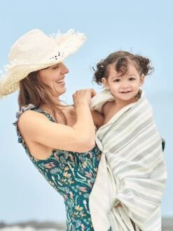 Lovely beach towels with timeless printed stripes! One side is towelling, the other is fouta – ideal to lie on comfortably.