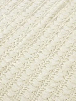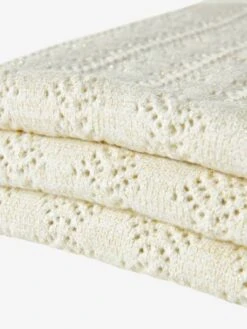 A lovely blanket in delicate pointelle knit, ideal to accompany and keep baby warm at home, or when on an outing. For a little bit of shine, it is woven with golden lurex threads
