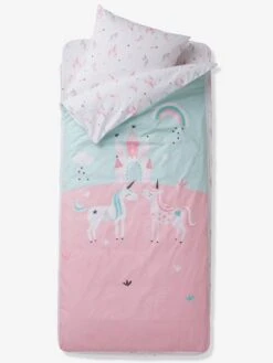 - Unicorns on the front of the duvet cover and small printed unicorns and stars on the pillowcase and back of the duvet cover