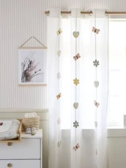 A lovely sheer curtain to create a lovely atmosphere in children’s bedrooms! It covers the window but lets a little light through to soothe children that don’t like being in complete darkness. With 3 garlands with 3D hearts, butterflies and flowers, it’s ideal to decorate the bedroom.