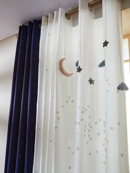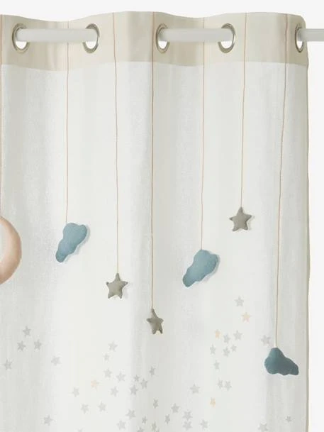 The moon, clouds, and pink and grey stars hang from tiny threads to decorate this pretty sheer curtain!