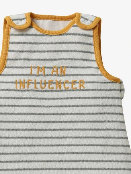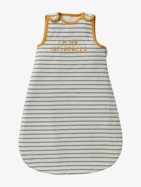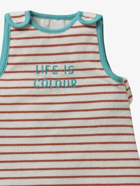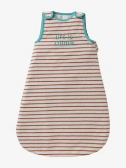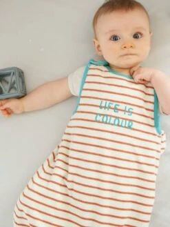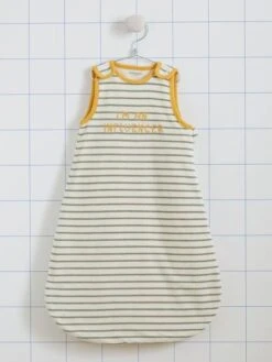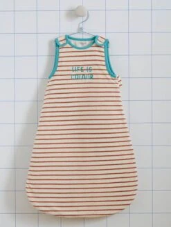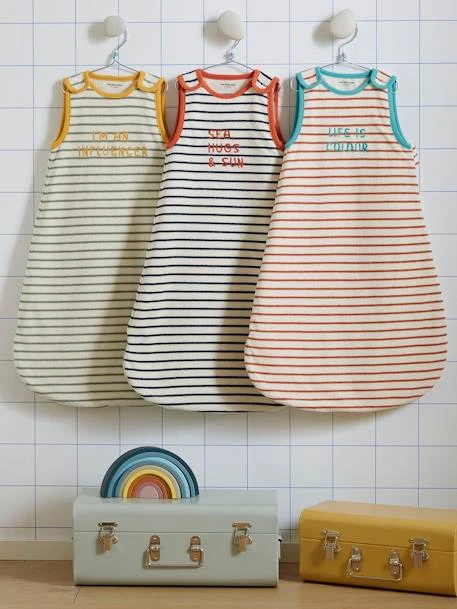 Terry cloth material and sailor-style stripes, it’s all you need for baby’s summer nights! A lightweight and trendy baby sleeping bag with its wide contrasting rib knit stripes and a small embroidered message to add extra character! Padding-free, it gently covers baby on warm summer nights.